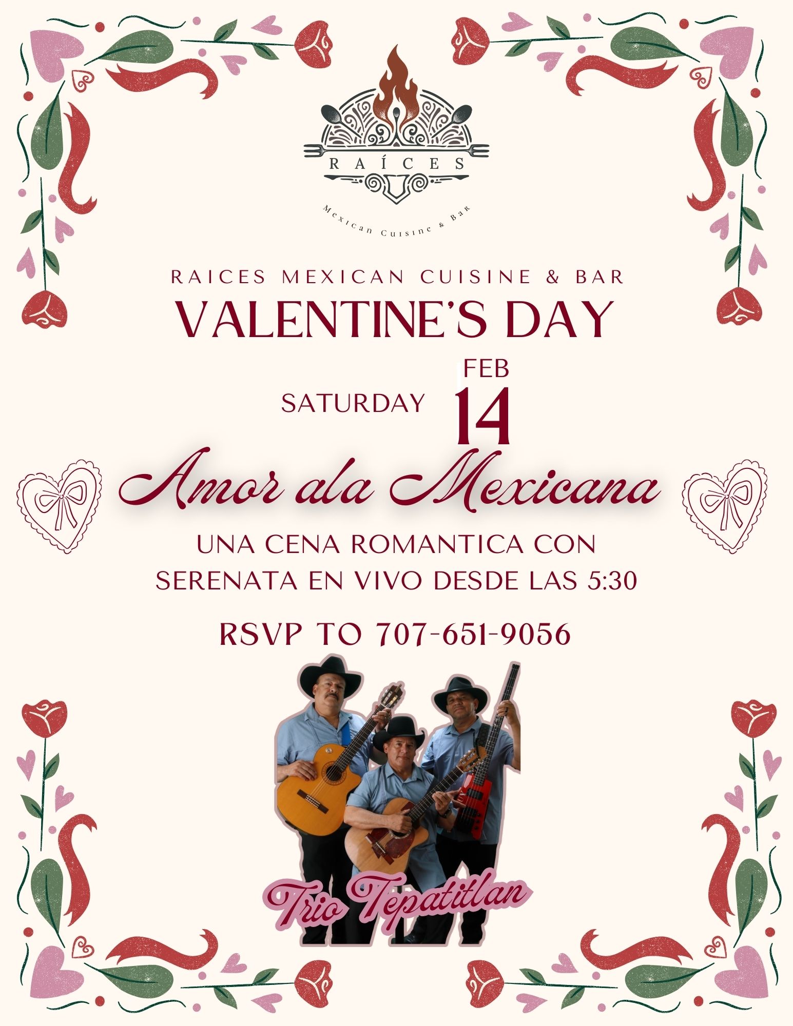 Acompáñanos este Día de San Valentín para una cena inolvidable con un menú especial de varios tiempos, copa de champaña de cortesía y serenata en vivo 🌹🎶 ✨ Cupo limitado — reserva hoy.