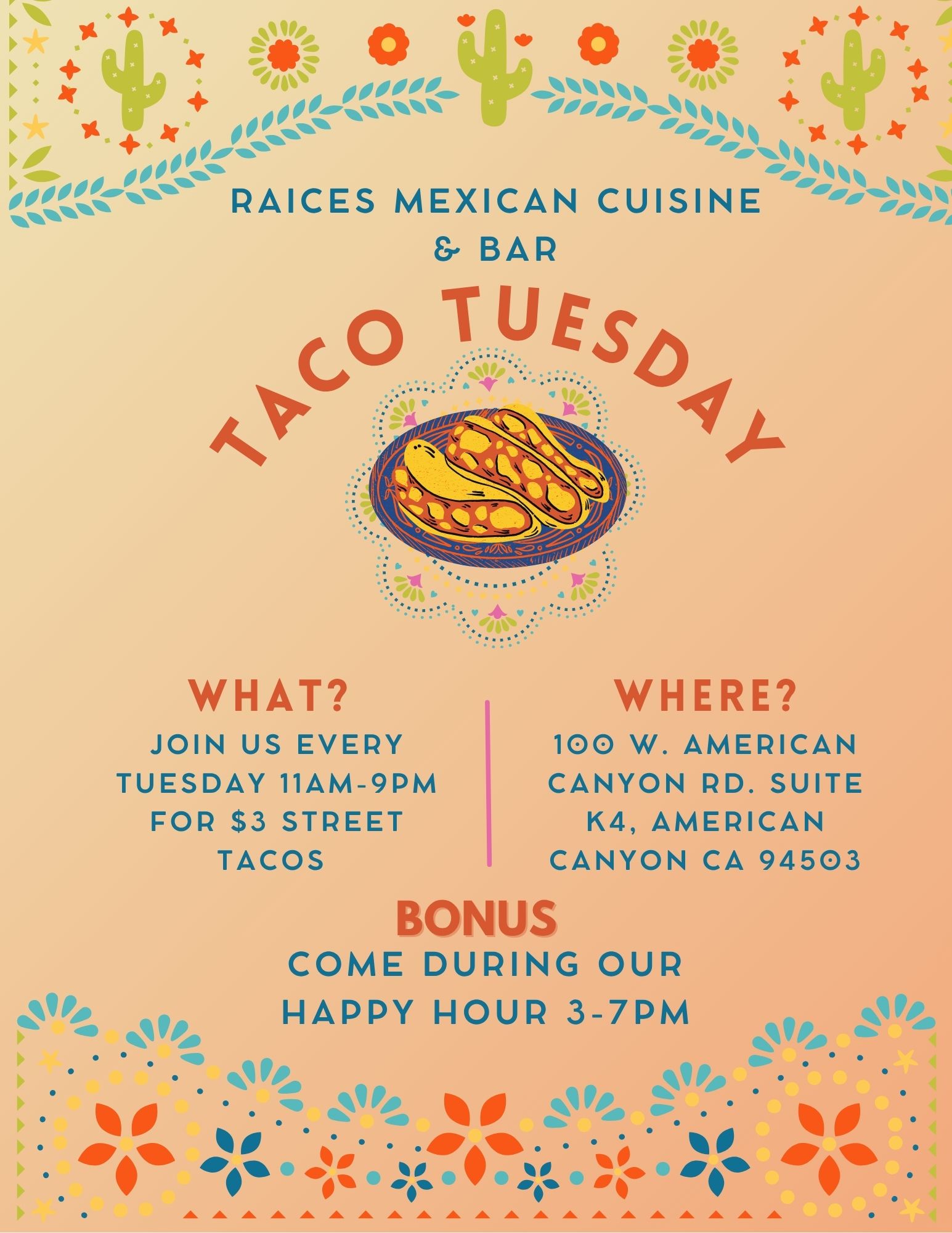 Welcome to Raíces, where we celebrate México and our passion for life, food, and mixology. Our kitchen offers a unique taste experience with fresh, locally sourced ingredients, expertly paired with handcrafted signature cocktails. With over 20 years in the restaurant industry, we’re excited to become your new local favorite.
